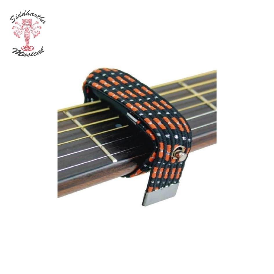 Capodastro ajustable para guitarra, fabricado en tela elástica resistente. Las superficies de contacto con el instrumento son montadas en caucho para evitar maltrato al instrumento. Liviano, portátil y muy fácil de manejar.